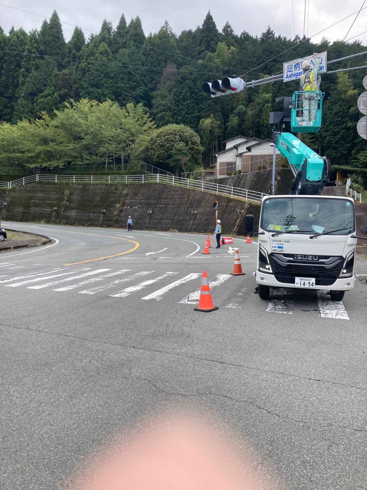 交差点名標識の交換工事 2025/10/04 面白いお仕事 交差点名を表示する標識をお目にかかる機会が多いと思います。 屋外のため当然劣化が生じ、文字が全く読めない状態となります。 そのため定期的に交換する工事が発生します。 今回はその仕事のご依頼を受け、御殿場市、小山町で警備を行いました。 作業員さんの車に同乗し数か所を回りましたが、都度変わる規制、土地勘が無い場所で適切な誘導を行えるよう 移動の度に作業員さん、隊員間で連携を取り無事任務終了となりました。 こうしたお仕事は普段とは経路が違い、ワクワクする楽しいお仕事です。